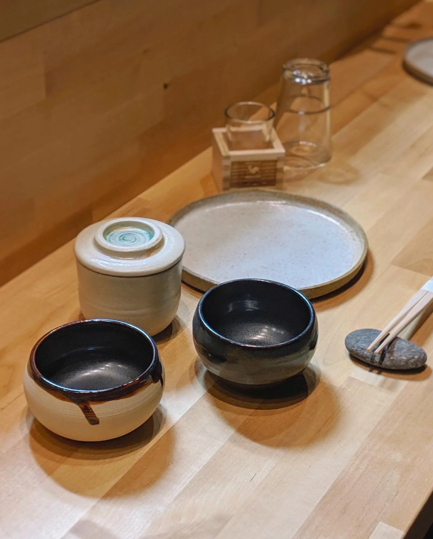A selection of wheel-thrown and slab built tableware for a Japanese Yakitori restaurant in Tallinn, headed by chef Margo Pauloja. The collection includes plates, bowls in a variety of sizes, lidded jars as well as sake cups and bottles.